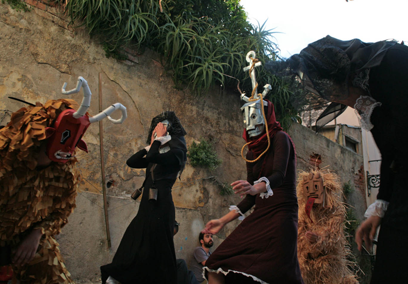 Performance: Máscaras de metal e madeira, tecido e palha.