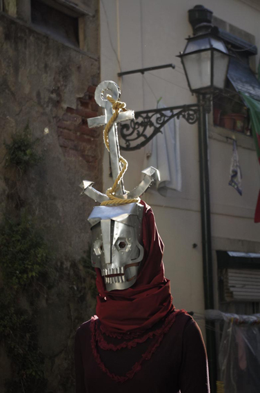 As a result of this investigative journey of the culture and local technique, Doitschinoff created an act with characters wearing masks re-enacting a religious procession, in which the public could follow the procession through the narrow streets of Lisbon towards the installations.